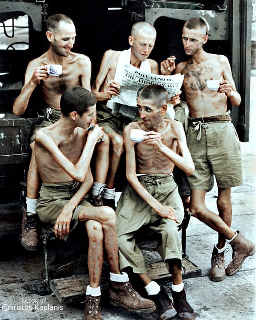 La fotografia, splendidamente colorizzata da Christos Kaplanis, cattura un momento raro e commovente: un gruppo di soldati australiani liberati, i corpi emaciati ma i volti che mostrano i primi segni di sollievo. Alcuni sorseggiano tè o caffè, altri sfogliano un giornale — gesti ordinari che devono essere sembrati straordinari dopo anni di privazioni.