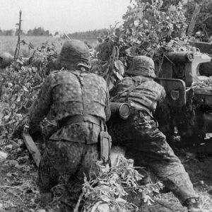 Im Raum Caen bedient eine deutsche Besatzung der 12. SS-Panzerdivision „H*tlerjugend“ eine 7,5-cm-PaK 40-Panzerabwehrkanone. Auf dem Foto deutsche Soldaten neben einem MG-34 Maschinengewehr während einer militärischen Ausbildung…