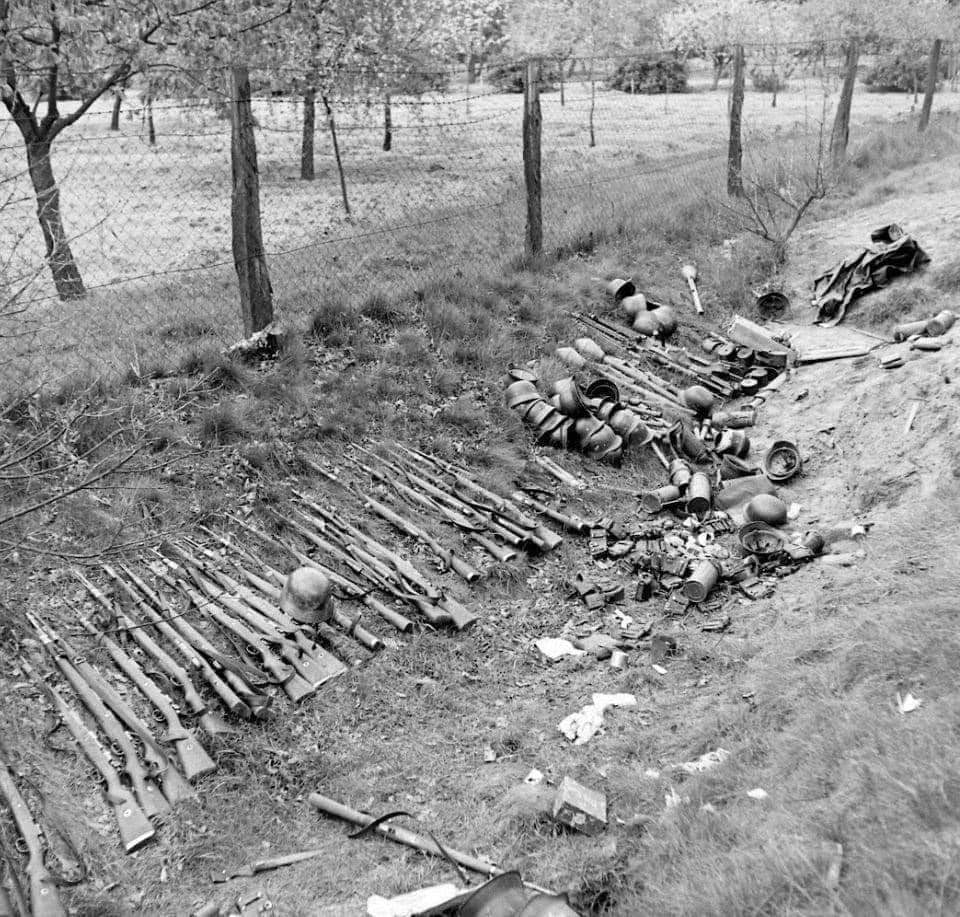 ai margini di una recinzione di filo spinato, presumibilmente al confine di un giardino o di un campo . Accanto a loro ci sono pile di elmetti d’acciaio (M35/M40/M42) , borracce, kit da mensa, munizioni e marsupi , e alcuni stivali e cappotti. Nessun bossolo sparato, nessun segno di impatto visibile: tutto suggerisce una resa ordinata , non una battaglia caotica.