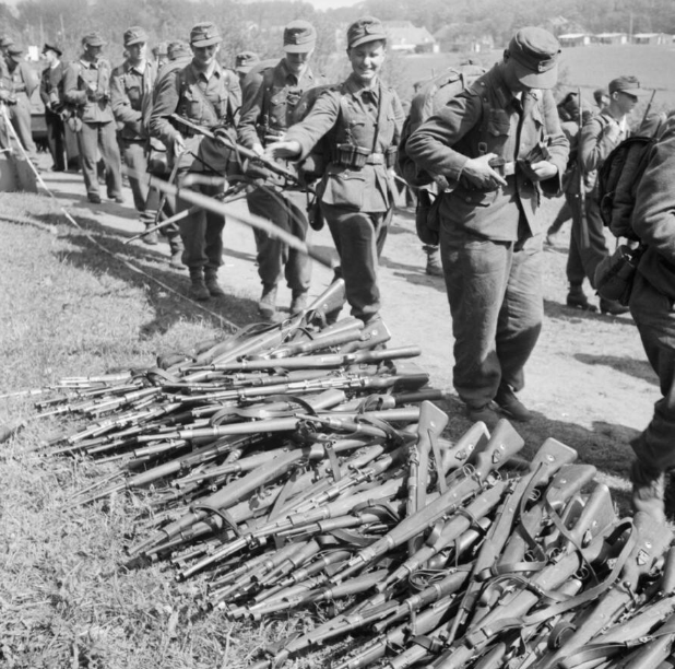 Tra la fine di aprile e l’inizio di maggio del 1945, le truppe alleate istituirono punti di raccolta per le armi nelle città e nei villaggi conquistati. I soldati tedeschi – spesso un mix di personale della Wehrmacht e della Volkssturm (Assalto Popolare) – dovettero consegnare armi ed equipaggiamento, furono registrati e poi portati via. Scene simili si ripeterono in molti luoghi, ai margini di villaggi, fattorie, caserme e ponti.