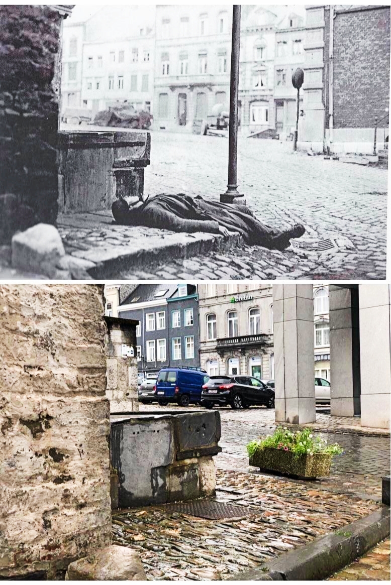 The body of an unknown Allied soldier awaits burial next to a road in the Ardennes in January 1945.